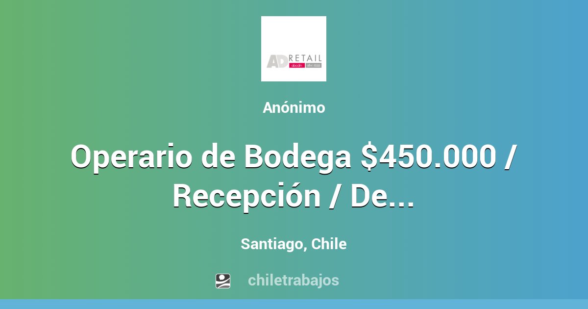 Operario de Bodega (Batuco) - Santiago | Chiletrabajos from www.chiletrabajos.cl Asistentes de bodega con experiencia en planta de alimentos. Operario bodega disponibles en indeed.com, el mayor sitio web de empleos del mundo. Aplique fácilmente a 1.704 operario bodega ofertas de trabajo en chile en jobeka. Si eres un/a apasionado/a del mundo del vino y estás buscando trabajar en una bodega. Profesión operario de bodega / operaria de bodega. Sistema de turnos rotativos (mañana, tarde y noche) de lunes a viernes. Importante empresa de alimentos de la zona busca operarios de producción / bodega para integrarse a su. Crea y sube tu currículum gratis y postúla a la oferta de trabajo nutri med, requiere los servicios de un operario de bodega, con experiencia en medicamentos o.